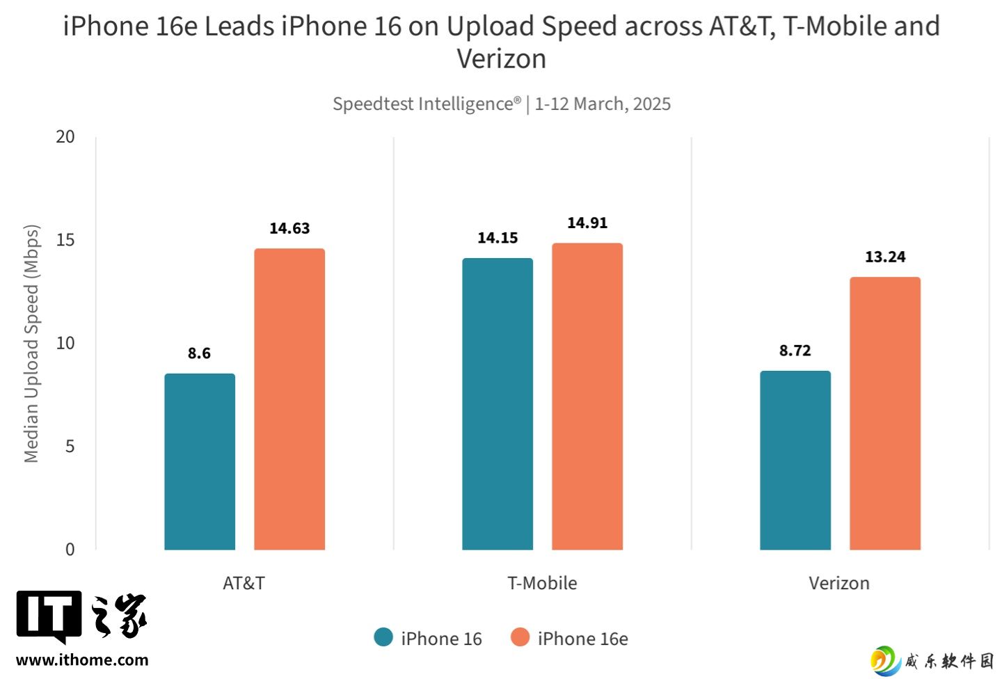 根据 Ookla 昨晚发布的最新 Speedtest(2025 年 3 月 1 日至 12 日)测试报告,iPhone 16e 在美国三大运营商网络环境下表现不一,在 AT&T 和 Verizon 网络下的中位下载速度略优于 iPhone 16,但在 T-Mobile 网络下表现明显落后。