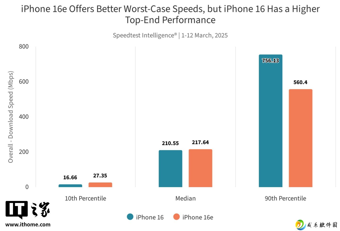值得注意的是,在下载速度最低的 10% 用户数据中,iPhone 16e 的表现明显优于 iPhone 16。