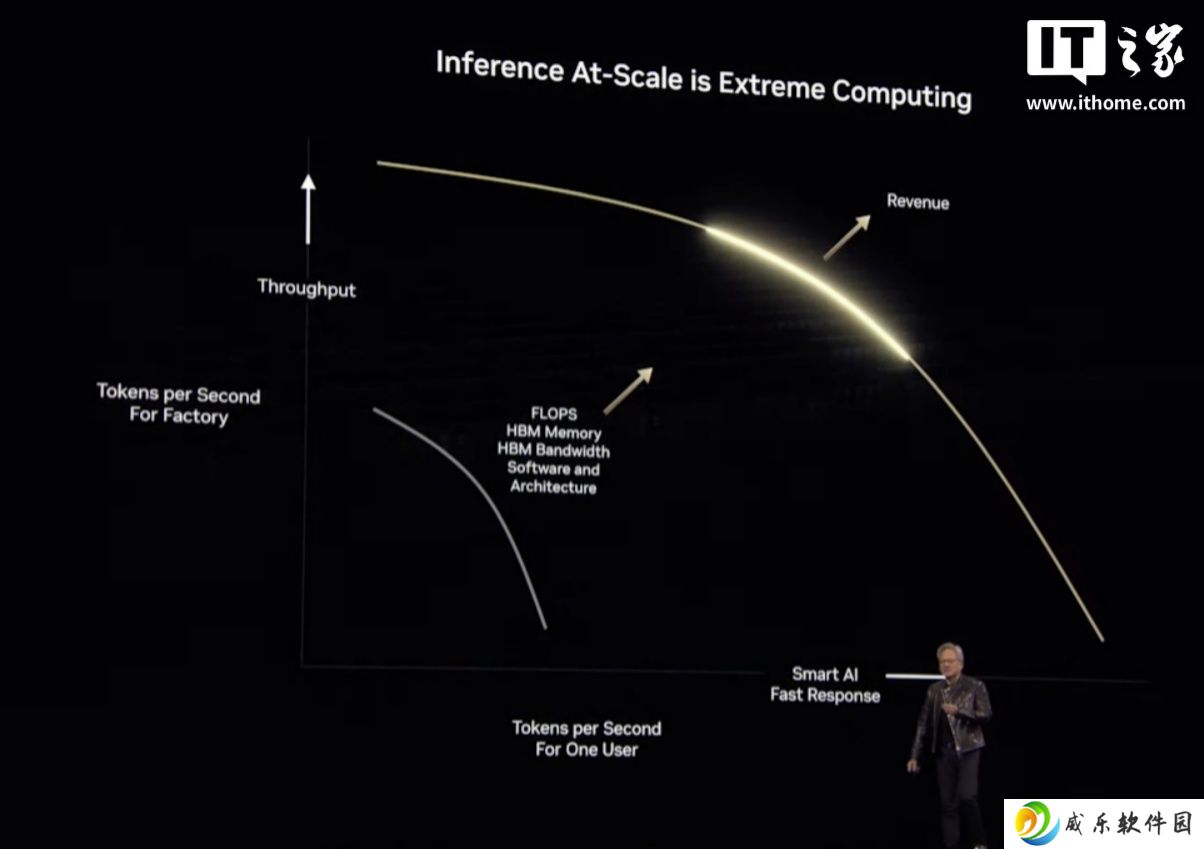 黄仁勋展示了一张关于推理的图表,X 轴显示用户每秒的 Token 数,Y 轴显示工厂每秒的 Token 数。