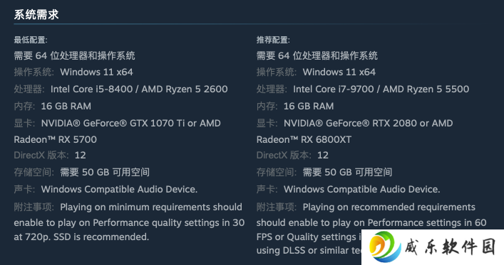 附注事项:满足推荐配置时,游戏可在性能模式下以 60 帧,1080P 画质运行;或在画质模式下以 30 帧运行(借助 DLSS 等技术可达 4K 分辨率)。需配备固态硬盘。